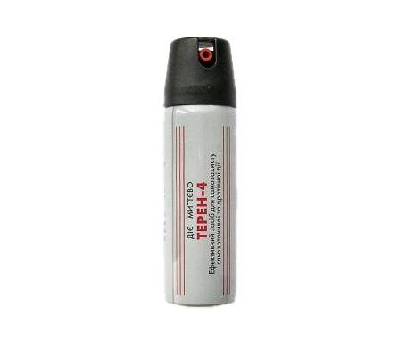 Газовый баллончик 'Терен-4' выполнен в форме аэрозольного баллона, внутри которого вещество слезоточивого и раздражающего действия (ирритант) - морфолид пеларгоновой кислоты. 'Терен-4' служит средством самообороны, эффективен против лиц, находящихся в состоянии алкогольного опьянения, а так же против собак. Результативная дальность применения достигает 2,5 м. Кроме того, Терен-4 очень прост в обращении: нужно удалить предохранительную пластину направить сопло баллона в лицо нападающего и нажать на кнопку.