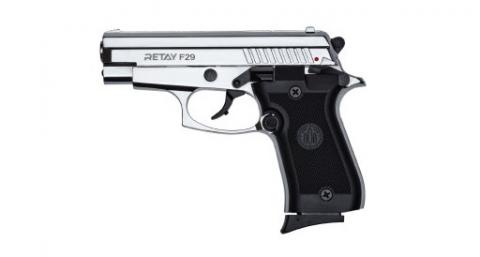 Retay F29 – это модель полуавтоматического стартового пистолета с двойным, по принципу действия, ударно-спусковым механизмом. Модель этого стартового пистолета является своеобразной вариацией Retay 84 FS, за тем только исключением, что у него другая конструкция кожуха затвора, а также изменения и пятка магазина. Магазин при этом изготовлен из стали. Хотя рама и затвор пистолета сделаны из легких сплавов. Магазин у Retay F29 9 мм Никель рассчитан на 9 патронов, плюс один можно загнать в патронник.