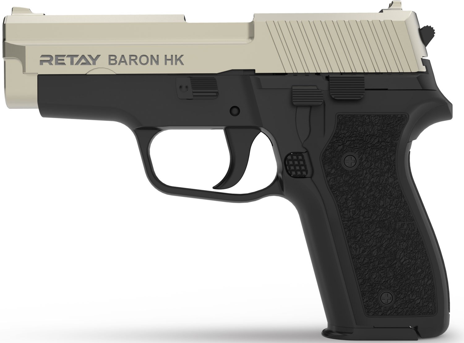 Стартовый пистолет Retay Baron HK Satin копия всем известного пистолета SIG Sauer P228. Пистолет отлично выполнен, в качестве материала для корпуса был выбран металлический сплав, который обеспечивает защиту от механических воздействий и высокую устойчивость к коррозии. Массогабаритные параметры пистолета: общая длина 178 мм, ширина 134 мм, масса 1010 г. Яркая и позитивная сторона впечатлений от пистолета Retay Baron HK Satin это его эргономика-пистолет прекрасно ложится в ладонь и позволяет сформировать очень комфортный и плотный хват.