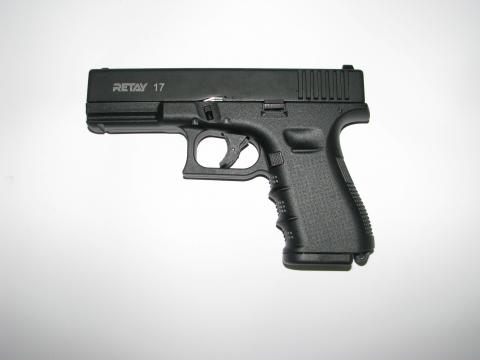 Стартовый пистолет Retay G17 выполнен по образцу и подобию боевого пистолета Glock 17. В сигнальном пистолете канал ствола полностью заглушен вставкой, применяются только холостые патроны калибра 9 мм. Изменение конструкции и попытки использовать шумовые пистолеты в качестве другого вида оружия пресекаются законом и влекут за собой уголовную ответственность. Для отвода пороховых газов используется небольшое дроссельное отверстие за патронником. На конце дульного среза имеется заглушка из пластика. Обойма пистолета рассчитана на 14 патронов, извлечение её осуществляется путем нажатия на кнопку на рукоятке. Воспроизводимый с его помощью звук выстрела достаточно громкий и реалистичный что позволяет использовать его для различных задач. Изначально стартовые пистолеты применялись на спортивных мероприятиях для подачи сигнала о начале старта. На сегодняшний день Retay G17 может применяться в случаях опасности для отпугивания противника или привлечения людей на помощь. Кроме того, эффективное средство против собак. Так же может использоваться в качестве пособия на начальном этапе обучения обращению с огнестрельным оружием. При выстреле за счет давления пороховых газов затвор пистолета откатывается назад, одновременно извлекая из патронника и выбрасывая далеко вправо стреляную гильзу. Retay G17 встает на затворную задержку после использования последнего патрона в обойме. Сигнальный револьвер Retay G17 приятно лежит в руке, рукоять эргономичной формы выполнена из качественного пластика. Пистолет хорошо сбалансирован, длина 186 мм, высота 130 мм. Для эффективной работы Retay G17 необходимо регулярно его чистить, для этого в комплект поставки входит ершик и нейтральное масло. Для транспортировки и хранения предусмотрен эргономичный пластиковый кейс. Retay G17 имеет массу преимуществ, но главное это конечно же бюджетная цена. Retay Arms- турецкий производитель огнестрельного, пневматического, газового и сигнально-шумового оружия. Компания является популярным экспортером в области оружия на мировом рынке.