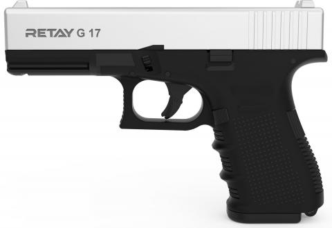 Стартовый пистолет Retay G17 Chrome выполнен по образцу и подобию боевого пистолета Glock 17. В сигнальном пистолете канал ствола полностью заглушен вставкой, применяются только холостые патроны калибра 9 мм. Изменение конструкции и попытки использовать шумовые пистолеты в качестве другого вида оружия пресекаются законом и влекут за собой уголовную ответственность. Для отвода пороховых газов используется небольшое дроссельное отверстие за патронником. На конце дульного среза имеется заглушка из пластика. Обойма пистолета рассчитана на 14 патронов, извлечение её осуществляется путем нажатия на кнопку на рукоятке. Воспроизводимый с его помощью звук выстрела достаточно громкий и реалистичный что позволяет использовать его для различных задач. Изначально стартовые пистолеты применялись на спортивных мероприятиях для подачи сигнала о начале старта. На сегодняшний день Retay G17 Chrome может применяться в случаях опасности для отпугивания противника или привлечения людей на помощь. Кроме того, эффективное средство против собак. Так же может использоваться в качестве пособия на начальном этапе обучения обращению с огнестрельным оружием. При выстреле за счет давления пороховых газов затвор пистолета откатывается назад, одновременно извлекая из патронника и выбрасывая далеко вправо стреляную гильзу. Retay G17 Chrome встает на затворную задержку после использования последнего патрона в обойме. Сигнальный пистолет Retay G17 Chrome приятно лежит в руке, рукоять эргономичной формы выполнена из качественного пластика. Пистолет хорошо сбалансирован, длина 186 мм, высота 130 мм. Для эффективной работы Retay G17 необходимо регулярно его чистить, для этого в комплект поставки входит ершик и нейтральное масло. Для транспортировки и хранения предусмотрен эргономичный пластиковый кейс. Retay G17 Chrome имеет массу преимуществ, но главное это конечно же бюджетная цена. Retay Arms- турецкий производитель огнестрельного, пневматического, газового и сигнально-шумового оружия. Компания является популярным экспортером в области оружия на мировом рынке.