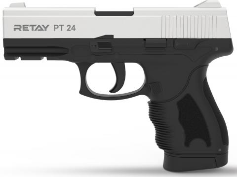 Стартовый пистолет Retay PT24 Chrome внешне копирует огнестрельный пистолет Taurus. За счет применения современных технологий и инновационных разработок модель имеет повышенный ресурс использования. В качестве материала для корпуса служит оружейный полимер, за счет этого пистолет устойчив к сколам и ударам, кроме того, может использоваться даже в ненастье. Вес оружия составляет 870 грамм. Эргономичная рукоятка имеет выемки под пальцы и рельефную не скользящую поверхность с уникальной текстурой, это обеспечивает более удобный и плотный хват оружия. 15-ти зарядный магазин извлекается при помощи кнопки на рукоятке. Стрельбу возможно вести только самозводом, затворная рама при пустом магазине пистолет становиться на затворную задержку. Ствол заглушен, соответственно применение других снарядов невозможно. На конце дульного среза имеется заглушка из пластика. Для отвода пороховых газов используется небольшое дроссельное отверстие за патронником. Retay PT24 Chrome в Украине находится в свободной продаже, то есть для его покупки и ношения не требуются специальные документы. При выстреле Retay PT24 Chrome воспроизводит громкий звук, который сопровождается вспышкой. Выстрел в воздух способен отпугнуть как злоумышленников, так и агрессивных животных. Стартовые пистолеты часто приобретают для защиты частных домов или квартир. Кроме того, Retay PT24 Chrome может использоваться для дрессировки собак. Возможно применение пистолета для обучения новичков, так как принцип работы схож с боевым оружием. Стоит помнить, что сигнальный пистолет, как и боевой, следует своевременно чистить и смазывать, для этого производитель комплектует пистолет нейтральным маслом и ершиком. Стоит отметить, что купить Retay PT24 Chrome может каждый желающий украинец, так как цена более чем доступная. К тому же модель обеспечена гарантией 90 дней. Retay Arms-турецкий производитель, появился на рынке более 10 лет назад. На сегодняшний день, компания завоевала репутацию во всем мире.