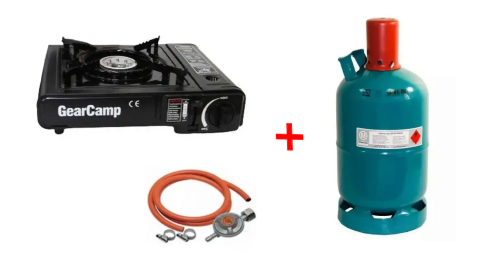 Газова плита "GearCamp'' у пластиковому кейсі під цанговий балон і під побутові балони. Класична модель одноконфоркової портативної плитки. Завдяки зручності використання й демократичній ціні, вона є найпопулярнішою моделлю. Багато людей, які стикаються з вимкненням електрики, і ті, хто просто любить подорожувати з комфортом, завжди мають у себе на дачі або в машині портативну плитку та запас газових балонів. Плита надійна, невибаглива і гранично проста у використанні. Має п'єзопідпал, переноситься в зручному пластиковому кейсе. Працює від цангового газового балона 220 грамів, який поміщається всередині плити та комплектується перехідником для під'єднання побутових балонів.