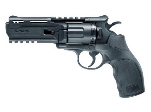 Umarex UX Tornado виробництва Umarex-це пневматичний револьвер, що стріляє за рахунок енергії вуглекислого газу. Одного балона достатньо для того, щоб здійснити близько 100-120 ефективних пострілів. Балончик міститься в рукоятку, як і в більшості газобалонних моделей. Слід зазначити, що зберігання зброї з активованим балоном може завдати шкоди механізму. Рукоятка ергономічна, має вирізи під пальці стрілка, завдяки чому револьвер відмінно лежить у руці. Боєприпаси необхідні для стрільби сталеві кульки ВР. Барабан-кліп моделі вміщує до 10 зарядів, в комплект поставки входять 2 додаткові барабани, це дозволить стрілку, швидко міняти барабани і не відволікатися на зарядку. Для безпечної роботи з револьвером є запобіжник. Стовбур у пістолета гладкий, довжиною 110 міліметрів. Ця модель має стандартні технічні показники, початкова швидкість сягає 120 м/с. Прицільна дальність моделі сягає 10-12 метрів. Корпус револьвера виконаний зі збройового пластику, що забезпечує її досить низьку вагу, яка становить 687 грам, так що револьвер буде зручний для використання навіть недосвідченим стрілкам. При цьому чудове балансування конструкції забезпечує комфортне прицілювання. На дотик і на вигляд пластик гарної якості. Шви між деталями рівні, гладкі. Деталі підігнані один до одного добре. Крім того, Umarex UX Tornado може використовуватися навіть у негоду. Ударно-спусковий механізм подвійної дії. Хід спускового гачка плавний. Момент спуску курка є досить передбачуваним і Ви після деякої практики зможете його контролювати. Прицільний механізм револьвера Umarex UX Tornado класичний представлений мушкою та цілком. Також є можливість встановлення додаткового прицільного обладнання. Отже, ми отримуємо дуже надійний, легкий і простий в експлуатації револьвер. До того ж Umarex UX Tornado є однією з найбюджетніших моделей виробника Umarex.