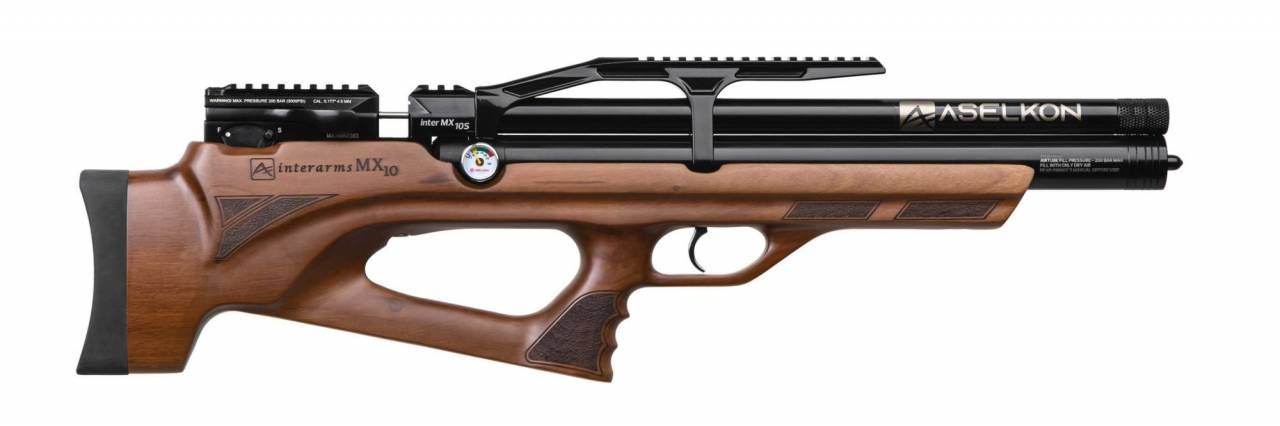 Пневматическая Редукторная PCP винтовка Aselkon MX10-S Wood - ложе с регулируемым подщёчником и эргономичной рукоятью для более удобного хвата, выполнено из дерева (орех), имеет мягкий затыльник не только смягчающий и без того незначительную отдачу, но и обеспечивает более удобную вкладку, благодаря чему вы сможете вести более кучную и прицельную стрельбу. Компоновка выполнена по схеме булл-пап, что позволило сократить общую длину винтовки. При этом в отличии от модели МХ-7 был так же укорочен ствол, что сделало винтовку ещё более компактной и манёвренной.