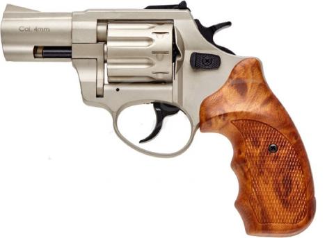 Рукоять револьвера сделана с накладками из качественного пластика под дерево, коричневого цвета, на которых имеются выступы, выемки, и насечка, работающие на крепость, вариативность и удобство хвата. Остальной корпус имеет обработку сатинированием, обеспечивающим и удобство импользования и отличный внешний вид.