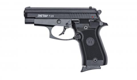 Retay F29 – это модель полуавтоматического стартового пистолета с двойным, по принципу действия, ударно-спусковым механизмом. Модель этого стартового пистолета является своеобразной вариацией Retay 84 FS, за тем только исключением, что у него другая конструкция кожуха затвора, а также изменения и пятка магазина. Магазин при этом изготовлен из стали. Хотя рама и затвор пистолета сделаны из легких сплавов. Магазин рассчитан на 9 патронов, плюс один можно загнать в патронник.