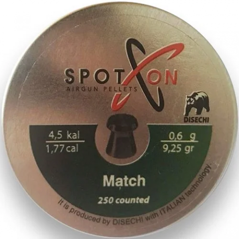 Пули пневматические Spoton Match 0.60 гр (250 шт), плоскоголовой формы.Данная форма предназначена для матчевой (спортивной) стрельбы по мишеням. Так как данная форма обеспечивает ровные, круглые отверстия, что очень удобно при подсчете очков, четко видно границы. Пули Турецкой компании по Итальянским технологиям.