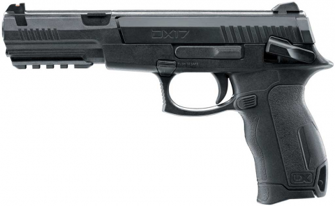 Пневматичний пістолет Umarex DX17 - ідеальний пневматичний пістолет для розважальної плінки. Як джерело енергії використовується кручена пружина і він стріляє або однією свинцевою кулею кал .177 і має зручний вбудований резервуар на 15 кульок BB. У DX17 є вбудована планка Пікатінні для кріплення лазерного цілепокажчика або ліхтаря, оптоволоконну мушку і зручну ергономічно рукоятку. Зазубрений слайд дозволяє легко брати і зводити пружину, а завантажувальний порт, що відкидається, спрощує завантаження кульок BB.