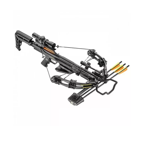 Блочный арбалет от Тайваньской фирмы Poe Lang модель Blade Plus в чёрном цвете, с силой натяжения в 40 футов. Ложе выполнено из алюминия, пистолетная рукоять и регулируемый приклад из пластика. Оптический прицел устанавливается на интегрированную планку Пикатинни. В комплект также влючено: - оптический прицел фиксированной кратности 4*32, - защитные очки, - три 20" болта , - кивер на 3 болта, - ручка переноса огня. - стопер тетивы, - воск для тетивы.