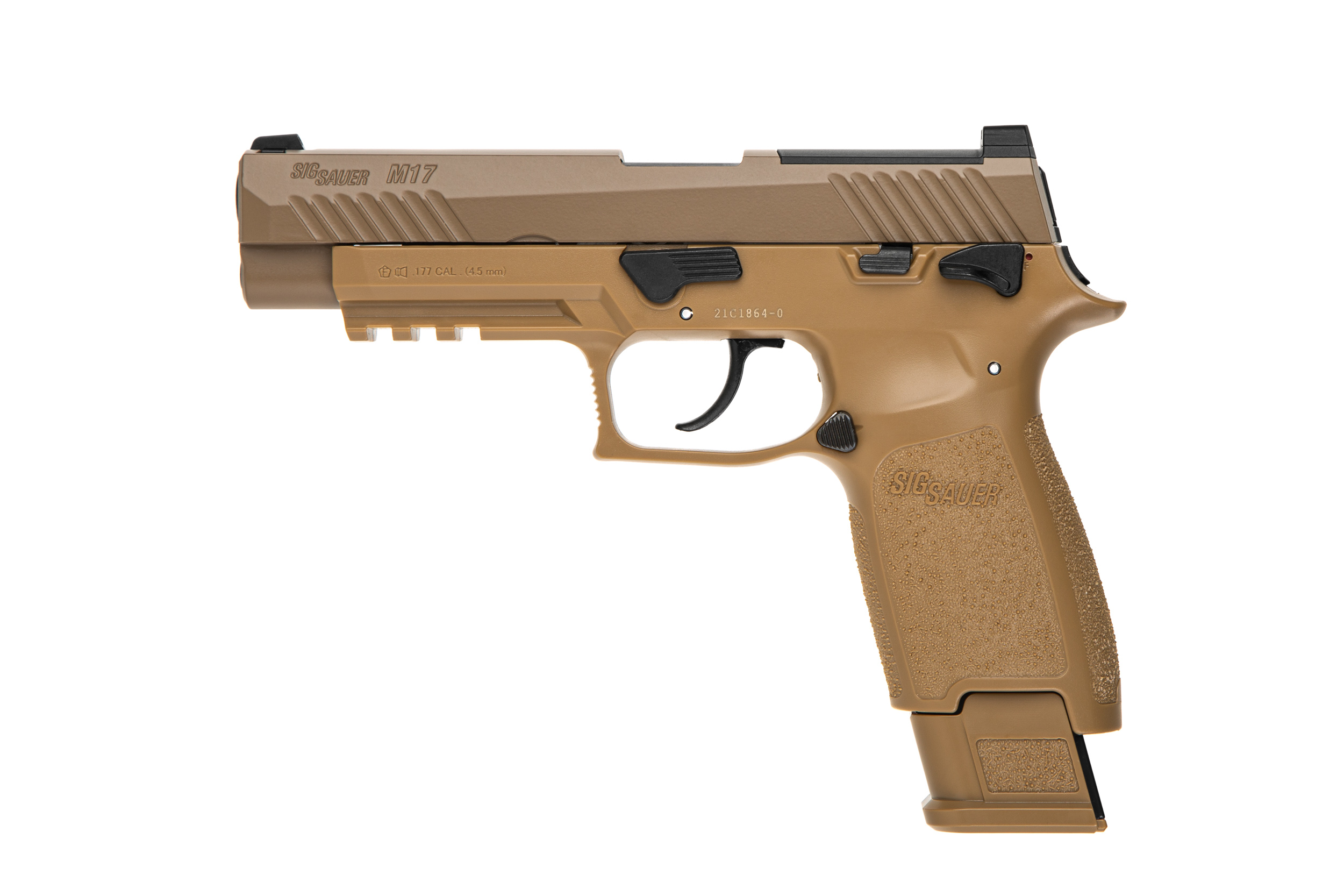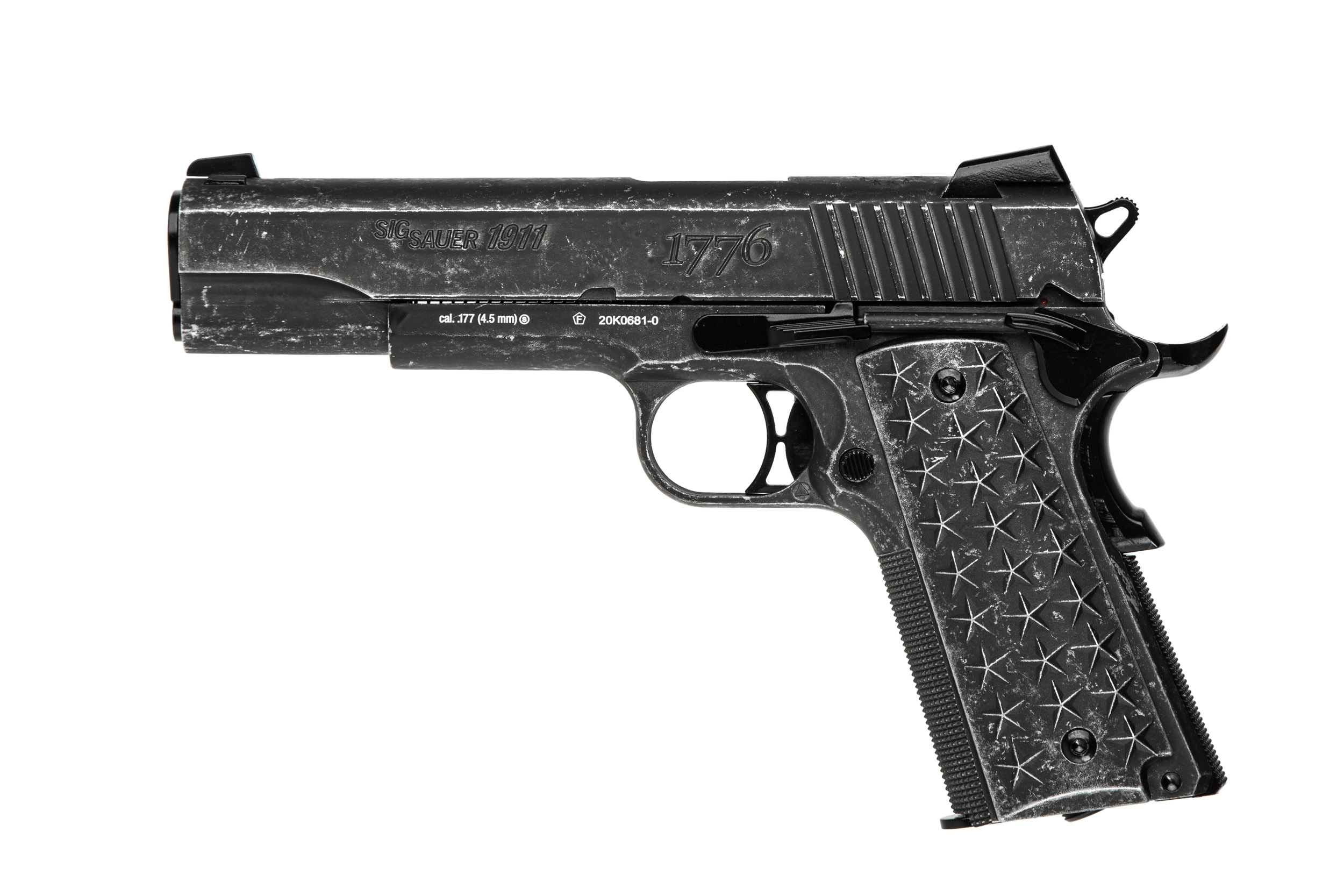 Стильная вариация легендарного пистолета Кольт 1911 от компании Sig Sauer, вдохновленная богатой патриотической историей США, пневматическая версия этого уникального американского пистолета имеет те же специальные рукоятки, украшенные 50 звездами (по 25 с каждой стороны), представляющие каждый штат. Специальная "потрепанная" отделка полностью металлических направляющей и рамы включает патриотические гравюры, такие как 13 звезд на верхней части и «We The People» и «1776» по бокам.