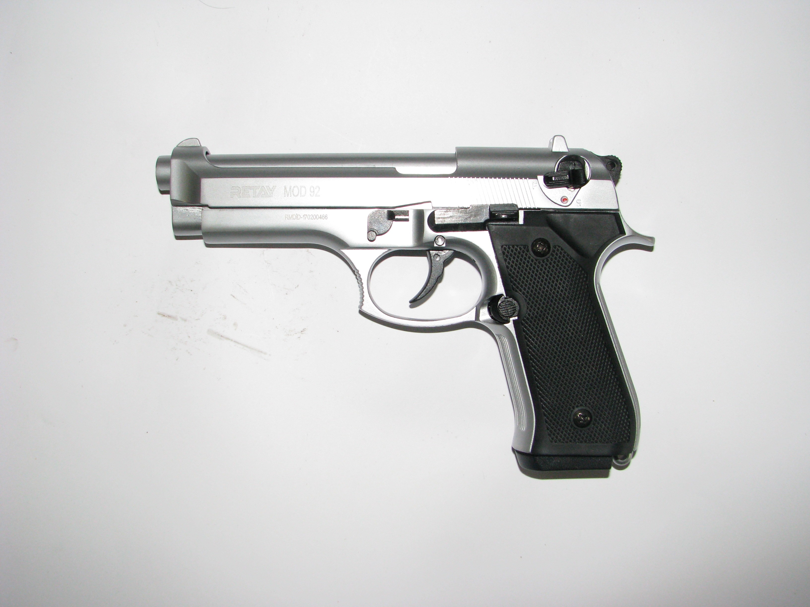 Сигнальный пистолет Retay Mod 92 Nickel является точной копией Beretta 92FS. Модель выполнена из металлического сплава, выглядит солидно и реалистично, вес составляет 1155 грамм. Стальной магазин вмещает 15 холостых патронов калибра 9 мм. Ствол заглушен, соответственно применение других снарядов невозможно. Для выхода пороховых газов в передней части патронника имеется небольшое отверстие. Изменение конструкции и попытки использовать шумовые пистолеты в качестве другого вида оружия пресекаются законом и влекут за собой уголовную ответственность. Габариты максимально приближены к прототипу: длина 212 миллиметров, а высота 140 миллиметров. Стрельба может вестись как самовзводом, так и с предварительным взводом курка. Во время ведения стрельбы в Retay Mod 92 Nickel можно заметить движение затвора, что делает его очень похожим на боевой Beretta 92FS. При пустом магазине пистолет становиться на затворную задержку. Сигнальное оружие в Украине находится в свободной продаже, то есть для его покупки и ношения справки и лицензии не требуется. Так же не возникнет проблем в случае утери или перепродажи. Эксплуатация сигнального пистолета Retay Mod 92 Nickel не вызовет затруднений и вполне безопасна. Получить травму при обращении возможно лишь при безрассудном применении оружия, например, выстреле в лицо. При выстреле возникает резкий громкий хлопок, вспышка и дым, это производит психологический эффект, который способен отпугнуть как злоумышленников, так и агрессивных животных. Так же стоит отметить, реалистичный внешний вид оружия. Благодаря крайней схожести с реальным образцом, возможно применение пистолета для обучения пользователей, которые желают получить навык первичного обращения с боевым оружием. Стоит помнить, что сигнальный пистолет, как и боевой, требует ухода- своевременной чистки и смазки, для этого в комплект входит нейтральной масло и ершик. Кроме того, Retay Mod 92 Nickel поставляется в пластиковом кейсе для удобства перевозки или хранения. Стоит отметить, что цена на Retay Mod 92 Nickel более чем доступная, при этом качество достойно восхищения.
