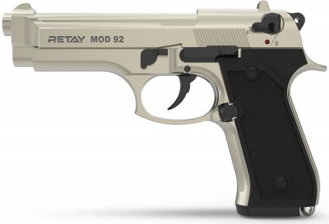 Сигнальный пистолет Retay Mod 92 Satin является точной копией Beretta 92FS. Модель выполнена из металлического сплава, выглядит солидно и реалистично, вес составляет 1155 грамм. Стальной магазин вмещает 15 холостых патронов калибра 9 мм. Ствол заглушен, соответственно применение других снарядов невозможно. Для выхода пороховых газов в передней части патронника имеется небольшое отверстие. Изменение конструкции и попытки использовать шумовые пистолеты в качестве другого вида оружия пресекаются законом и влекут за собой уголовную ответственность. Габариты максимально приближены к прототипу: длина 212 миллиметров, а высота 140 миллиметров. Стрельба может вестись как самовзводом, так и с предварительным взводом курка. Во время ведения стрельбы в Retay Mod 92 Satin можно заметить движение затвора, что делает его очень похожим на боевой Beretta 92FS. При пустом магазине пистолет становиться на затворную задержку. Сигнальное оружие в Украине находится в свободной продаже, то есть для его покупки и ношения справки и лицензии не требуется. Так же не возникнет проблем в случае утери или перепродажи. Эксплуатация сигнального пистолета Retay Mod 92 Satin не вызовет затруднений и вполне безопасна. Получить травму при обращении возможно лишь при безрассудном применении оружия, например, выстреле в лицо. При выстреле возникает резкий громкий хлопок, вспышка и дым, это производит психологический эффект, который способен отпугнуть как злоумышленников, так и агрессивных животных. Так же стоит отметить, реалистичный внешний вид оружия. Благодаря крайней схожести с реальным образцом, возможно применение пистолета для обучения пользователей, которые желают получить навык первичного обращения с боевым оружием. Стоит помнить, что сигнальный пистолет, как и боевой, требует ухода- своевременной чистки и смазки, для этого в комплект входит нейтральной масло и ершик. Кроме того, Retay Mod 92 Satin поставляется в пластиковом кейсе для удобства перевозки или хранения. Стоит отметить, что цена на Retay Mod 92 Satin более чем доступная, при этом качество достойно восхищения.
