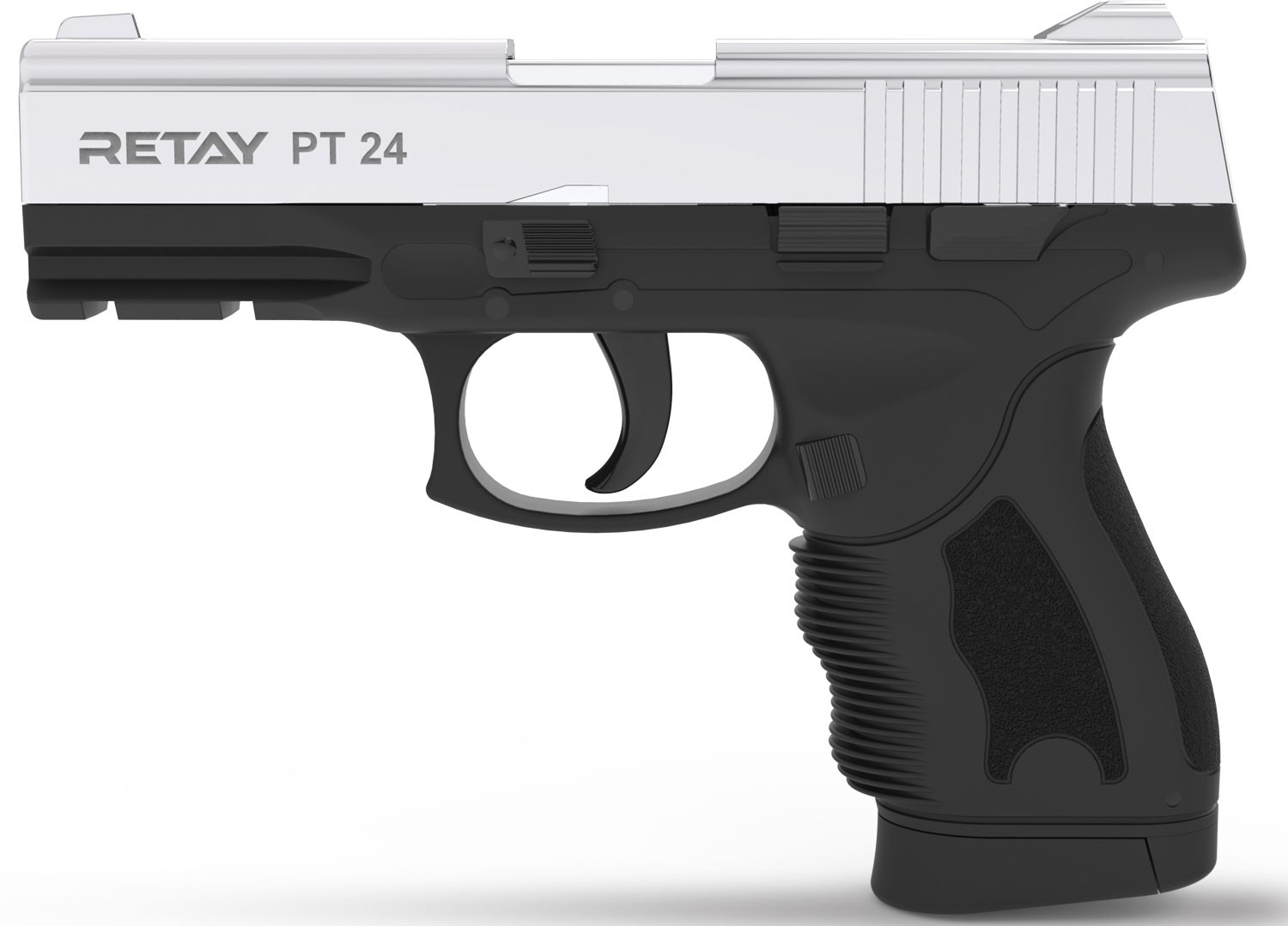Стартовый пистолет Retay PT24 Nickel внешне копирует огнестрельный пистолет Taurus. За счет применения современных технологий и инновационных разработок модель имеет повышенный ресурс использования. В качестве материала для корпуса служит оружейный полимер, за счет этого пистолет устойчив к сколам и ударам, кроме того, может использоваться даже в ненастье. Вес оружия составляет 870 грамм. Эргономичная рукоятка имеет выемки под пальцы и рельефную не скользящую поверхность с уникальной текстурой, это обеспечивает более удобный и плотный хват оружия. 15-ти зарядный магазин извлекается при помощи кнопки на рукоятке. Стрельбу возможно вести только самозводом, затворная рама при пустом магазине пистолет становиться на затворную задержку. Ствол заглушен, соответственно применение других снарядов невозможно. На конце дульного среза имеется заглушка из пластика. Для отвода пороховых газов используется небольшое дроссельное отверстие за патронником. Retay PT24 Nickel в Украине находится в свободной продаже, то есть для его покупки и ношения не требуются специальные документы. При выстреле Retay PT24 Nickel воспроизводит громкий звук, который сопровождается вспышкой. Выстрел в воздух способен отпугнуть как злоумышленников, так и агрессивных животных. Стартовые пистолеты часто приобретают для защиты частных домов или квартир. Кроме того, Retay PT24 Nickel может использоваться для дрессировки собак. Возможно применение пистолета для обучения новичков, так как принцип работы схож с боевым оружием. Стоит помнить, что сигнальный пистолет, как и боевой, следует своевременно чистить и смазывать, для этого производитель комплектует пистолет нейтральным маслом и ершиком. Стоит отметить, что купить Retay PT24 Nickel может каждый желающий украинец, так как цена более чем доступная. К тому же модель обеспечена гарантией 90 дней. Retay Arms-турецкий производитель, появился на рынке более 10 лет назад. На сегодняшний день, компания завоевала репутацию во всем мире.