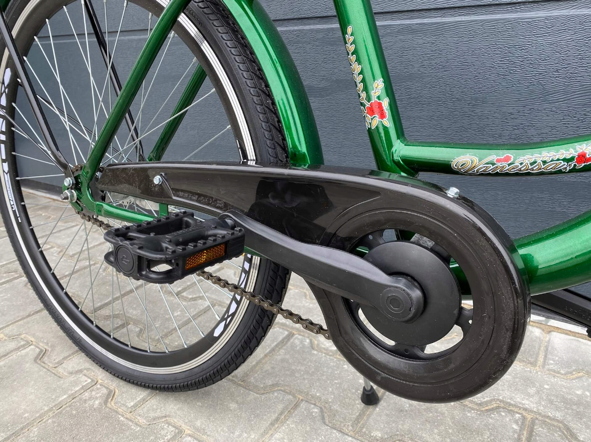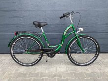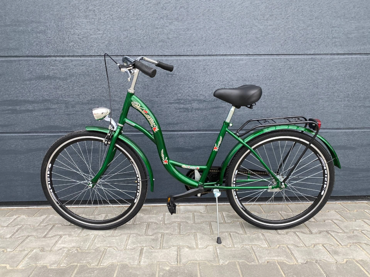 Велосипед оснащен стальными брызговиками, удобными ручками, подножкой и комплектом освещения.