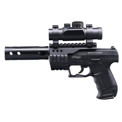 В пневматическом пистолете Walther Night Hawk внедрены самые современные технологические решения: нарезной ствол из нержавеющей стали, двухступенчатая винтовая система прокола баллона; высококачественная клапанная система, предохраняющая потерю газа из баллона при длительном хранении; усиленный компенсатор; 8-зарядный барабан клип. Также пистолет обладает многосторонними планками Пиккатини.В комплекте с пистолетом идет коллиматорный прицел и глушитель, выполняющий роль надульника.